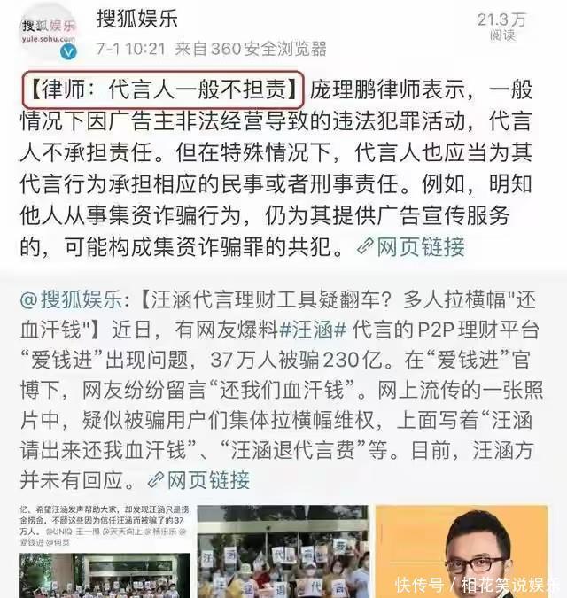 但实际上有些明星选择产品纯看代言价怎么样,根本就不考虑其他的。之前汪涵就曾代言过一个品牌,当时不少人把自己的血汗钱投进去了,但最后却是血本无归,不少人直接怒气冲冲要找汪涵这个代言人。